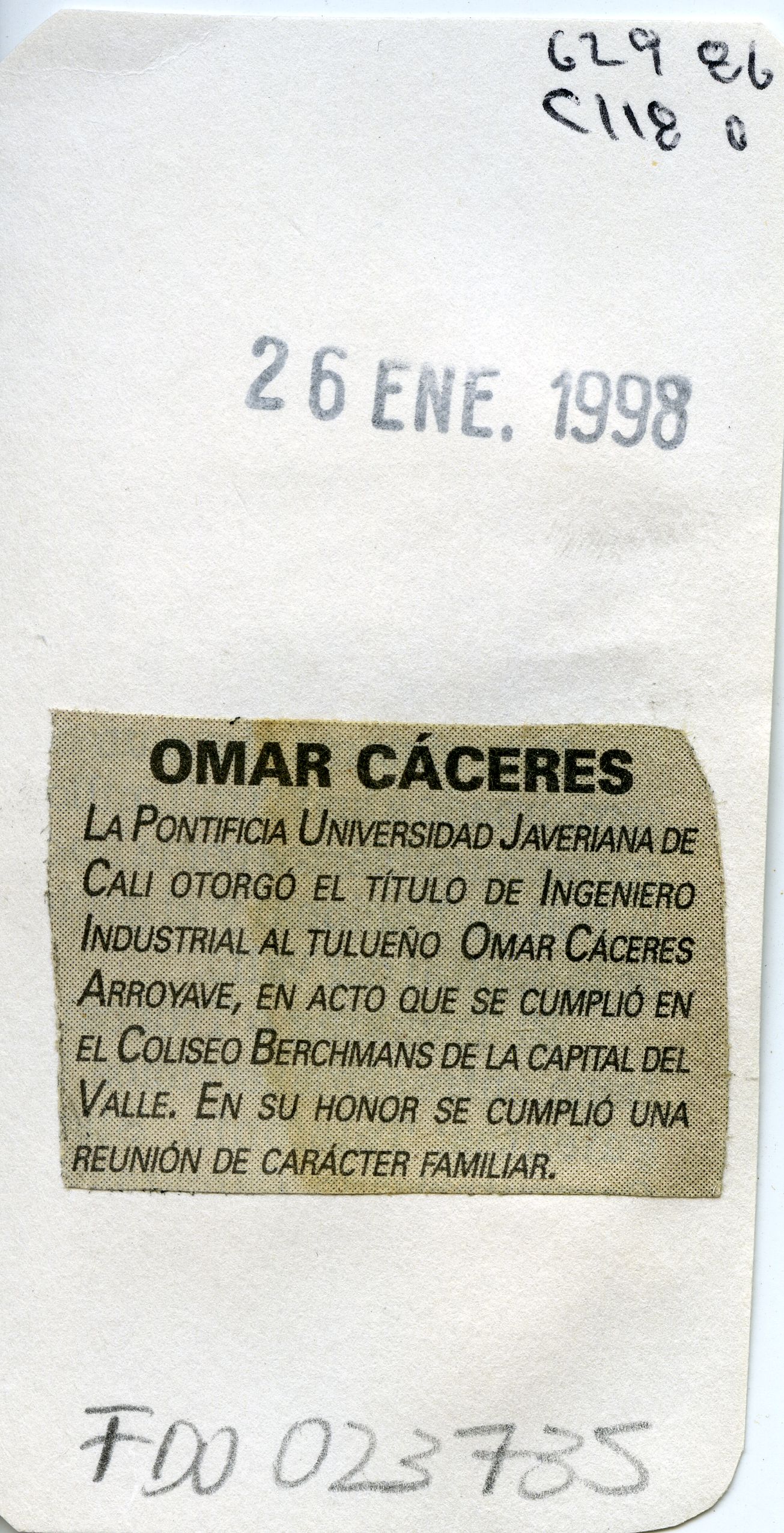 La pontificia Universidad Javeriana de Cali otorgó el título de Ingeniero Industrial al Tulueño Omar Cáceres Arroyave, en acto que se cumplió en el colegio Berchmans de la capital del Valle. En su honor se cumplió una reunión de carácter familiar