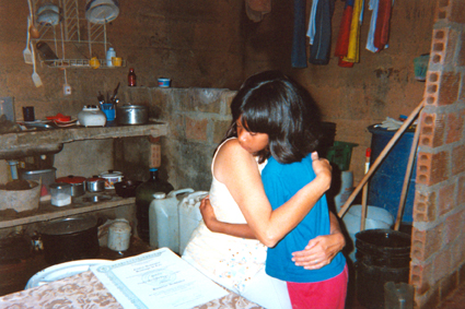 | dc.description | Plano medio. Interior noche. Foto tomada con flash. Una niña le da un profundo abrazo a otra persona. Sobre la mesa con mantel descansa una hoja de grado de colegio. En la parte de atrás de la imagen en penumbra vemos la cocina elemental en ladrillo, trastes, ollas y ropa colgada. | spa |