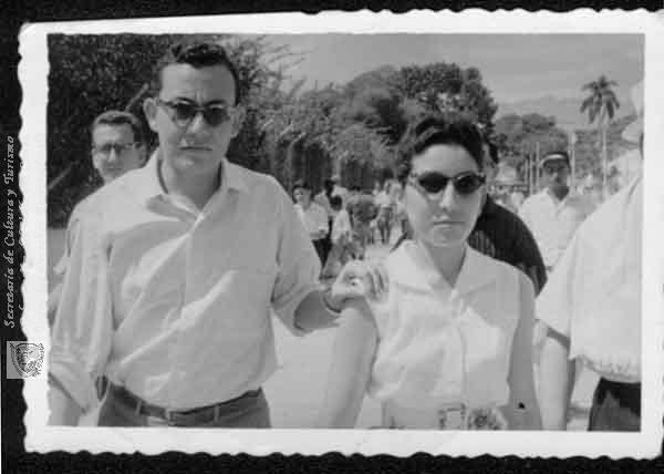Sócrates Quintero y Socorro Gómez., paseando por la calle 12, sector comercial de la ciudad. Santiago de Cali, C. 1.958