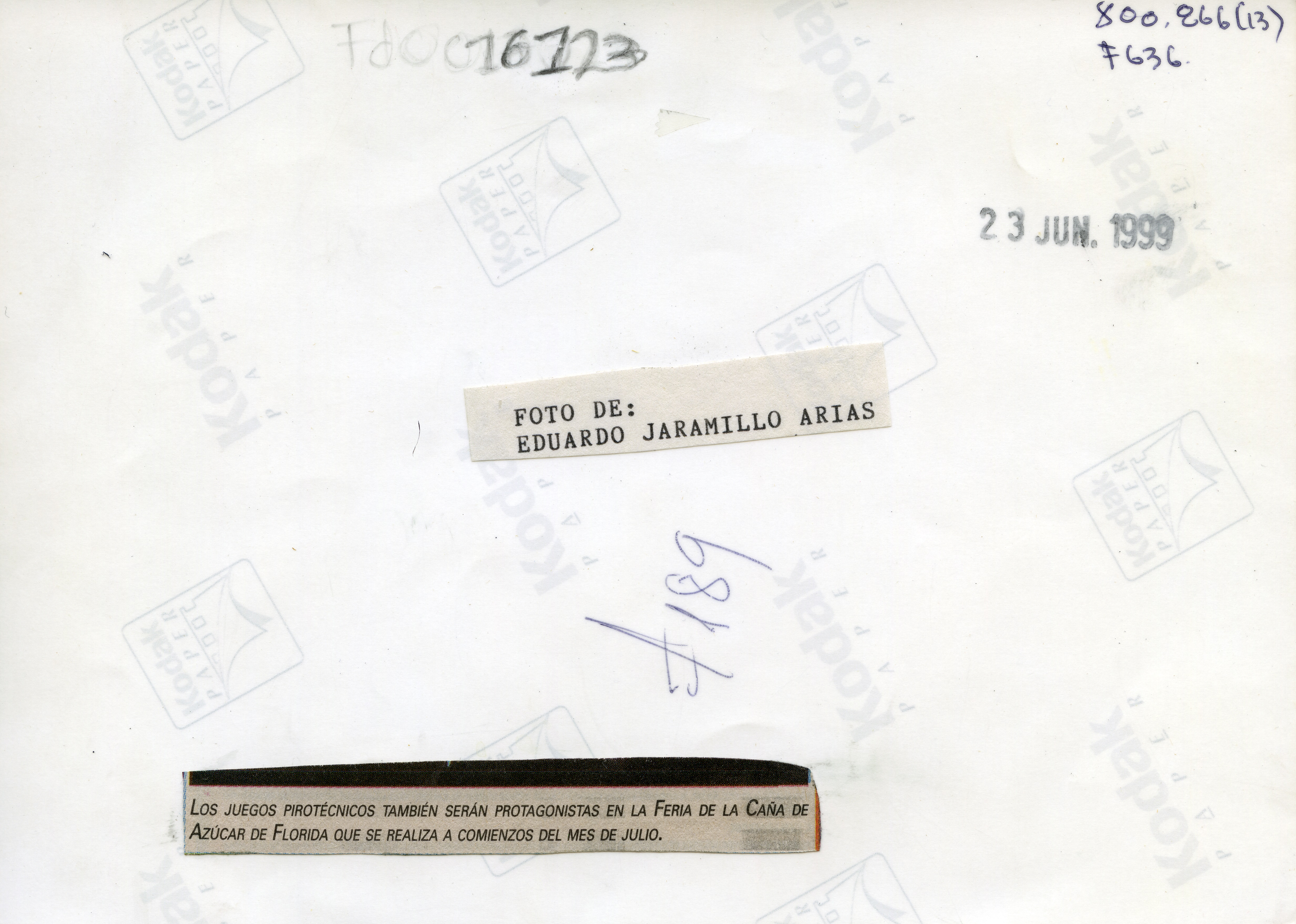Al reverso de la fotografía se anexa recorte: "Los juegos pirotécnicos también serán protagonistas en la Feria de la Caña de Azúcar de Florida que se realiza a comienzos del mes de julio."
