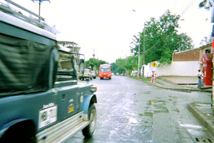 Plano general. En la imagen se puede apreciar un vehiculo de color azul oscuro de transporte público, transitando por una vía. Al fondo un bus de color rojo. Al extremo derecho algunas edificaciones.