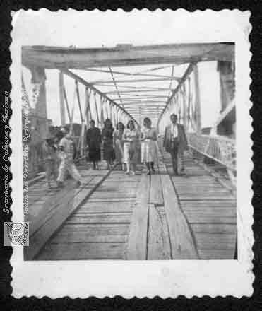 Las salidas familiares o paseos domingueros, hacen parte de las costumbres de los vallecaucanos. Las familias tradicionales usaban sus mejores trajes haciendo gala de su buen gusto y distinción. Paseo por el antiguo Puente de madera, Anacaro, sobre el río Cauca. Cartago, 1940.