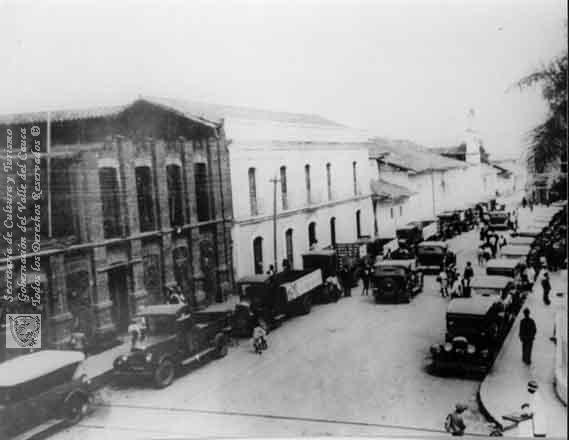 Costado sur del Parque Cabal, al lado el parqueadero de los taxis. Guadalajara de Buga, fecha aproximada, 1940.
