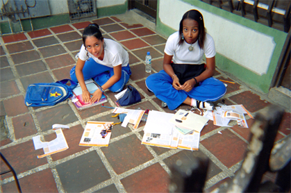| dc.description | Dos niñas adolescentes miran la cámara. Se encuentran sentadas realizando labores escolares. Toma en picado. Plano medio. | spa |