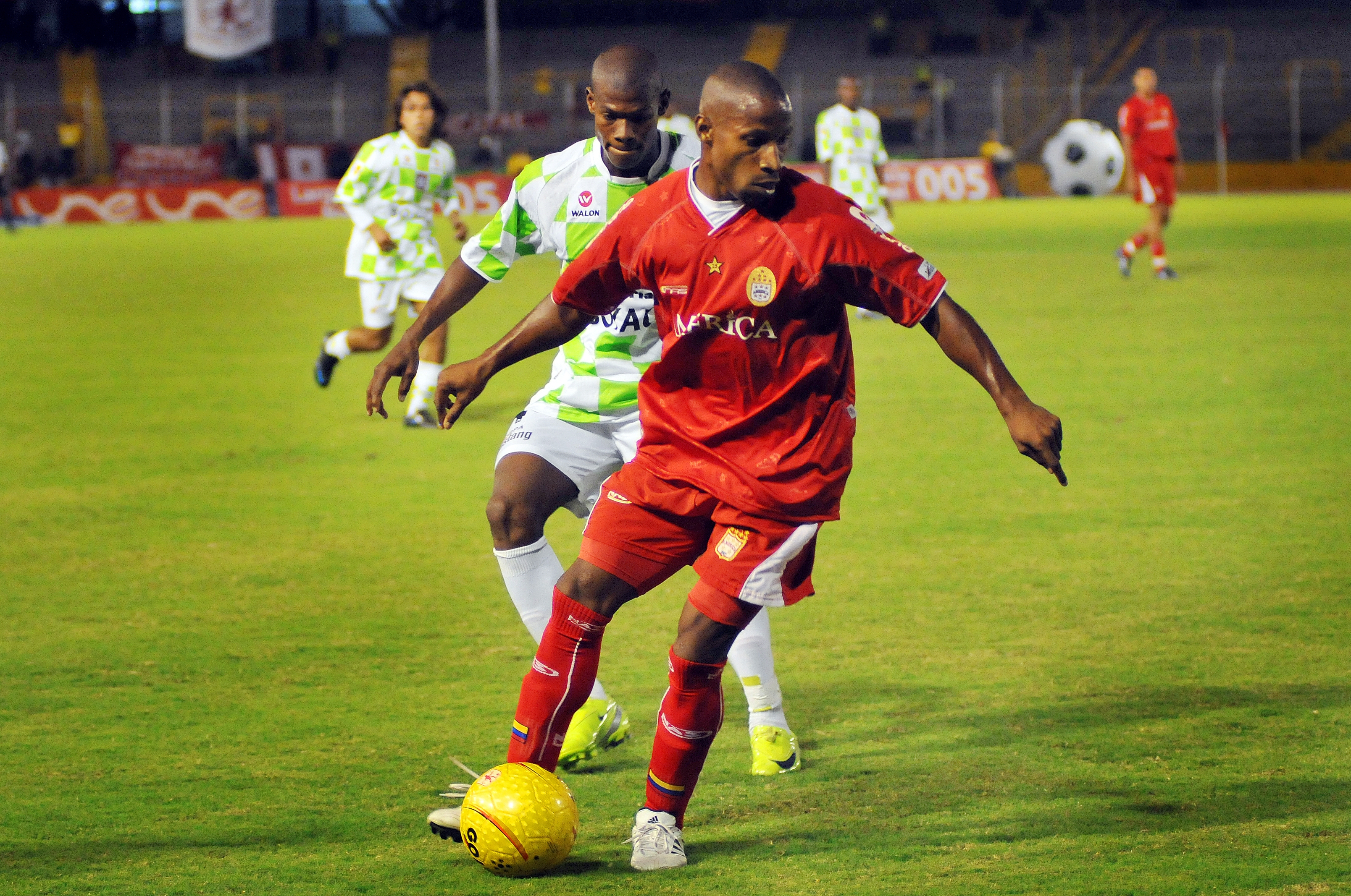Plano completo del jugador del América de Cali, Víctor Cortés defendiendo balón del jugador del Boyacá Chicó FC.