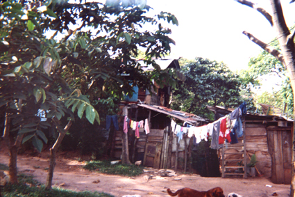 | dc.description | Plano medio de la fachada medio construida en tablas de madera y zinc. Tiene dos plantas y tiene aspecto medio derruido. Vemos ropa colgada y perros. La naturaleza rodea la casa. | spa |