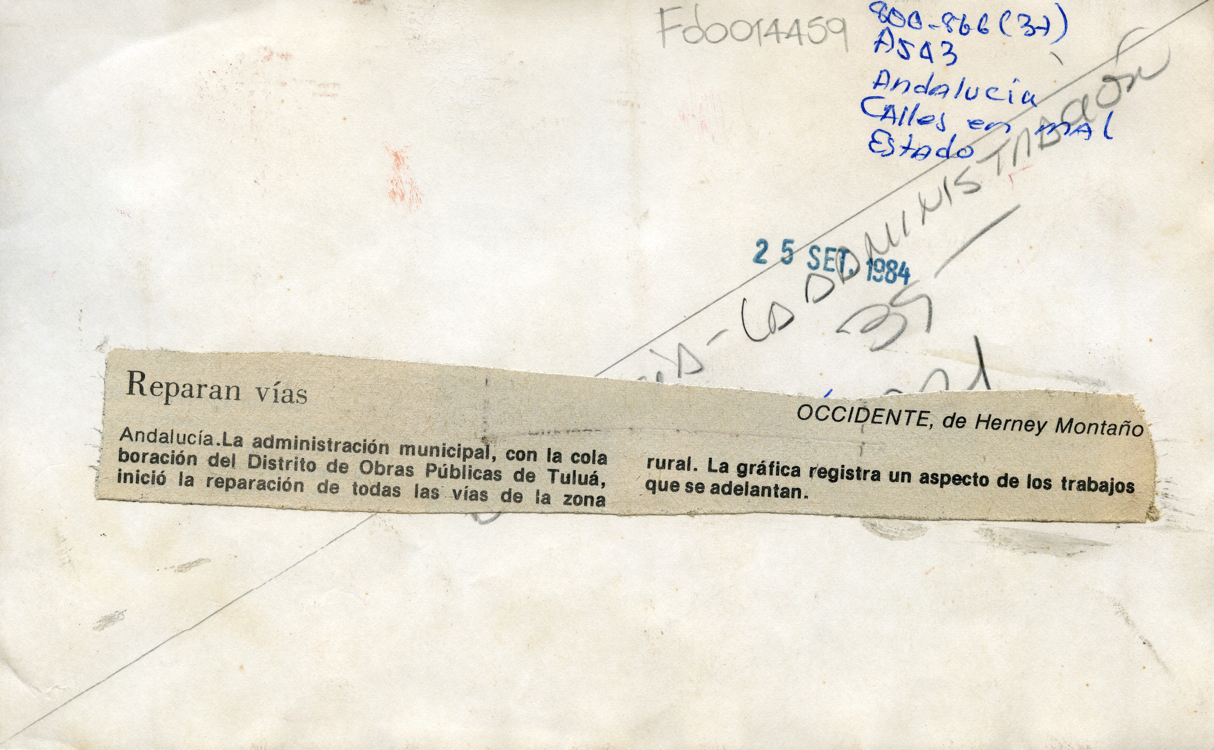 Tractor nivelador trabajando sobre la carretera en proceso de pavimentación. Al reverso de la fotografía se anexa recorte: "Reparan vías. La administración municipal, con la colaboración del Distrito de Obras Públicas de Tuluá, inició la reparación de todas las vías de la zona rural. La gráfica registra un aspecto de los trabajos que se adelantan".
