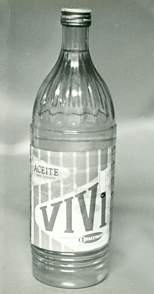 Frasco de aceite vegetal Vivi. // El Archivo del Patrimonio Fotográfico y Fílmico del Valle del Cauca es responsabilidad de la Biblioteca Departamental del Valle Jorge Garcés Borrero, por convenio de cooperación suscrito con la Secretaría de Cultura Departamental, con el fin de aunar esfuerzos para la conservación, preservación y divulgación del Archivo entre la comunidad Vallecaucana, especialmente entre los estudiantes e investigadores que visitan la Biblioteca, propiciando su uso y consulta permanente. La universidad Icesi es un colaborador en el proceso de difusión, facilitando la tecnología que permite la consulta de las imágenes.