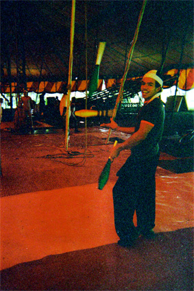 Plano Medio. Puesta en escena de un hombre joven realizando malabares con pinos. Al fondo algunas estructuras que no se alcanzan a definir debido a las escasas condiciones de luz.
