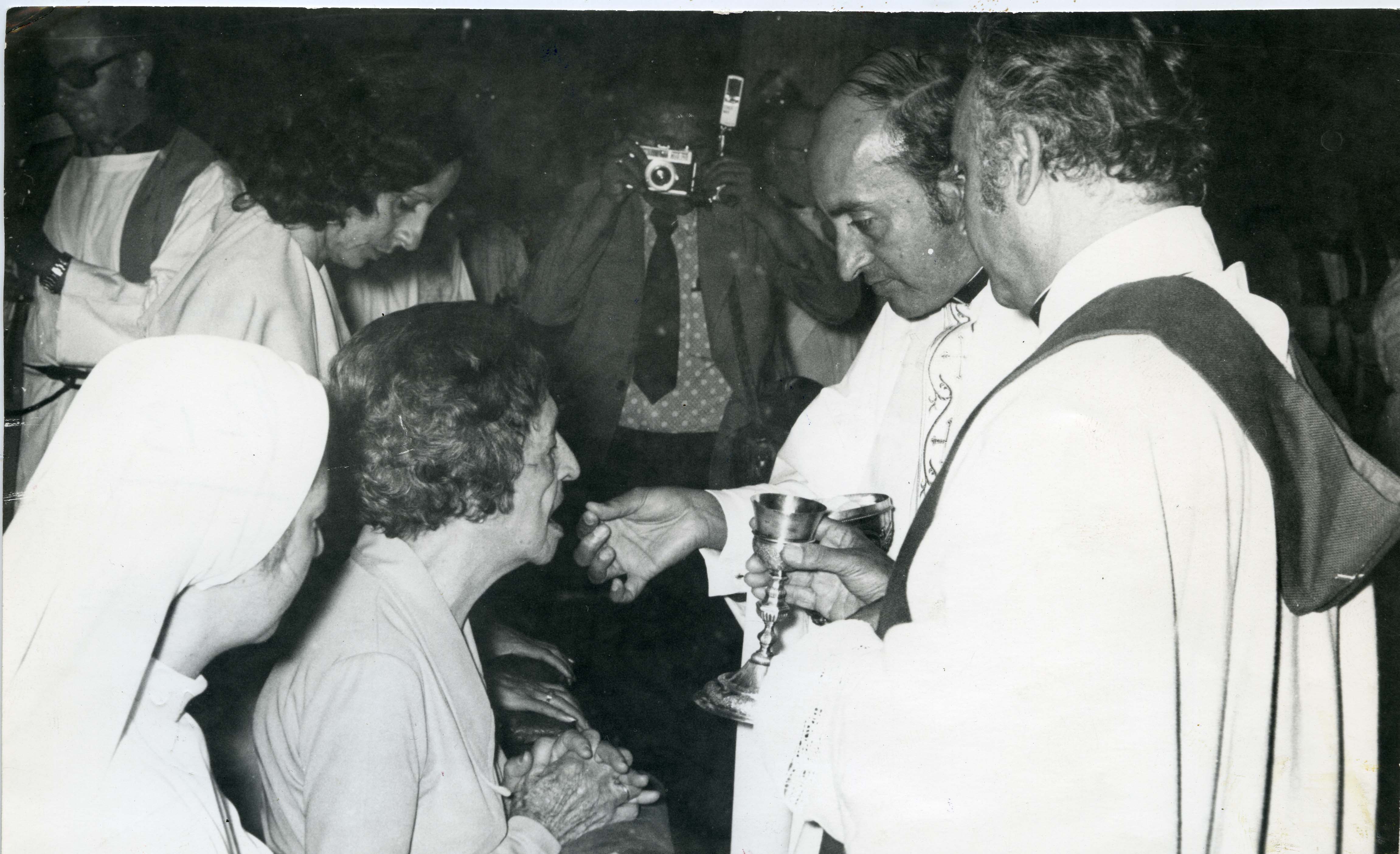 Sacerdote Alfonso Hurtado Galvis. Observamos al padre cuando entrega la hostia consagrada a una mujer