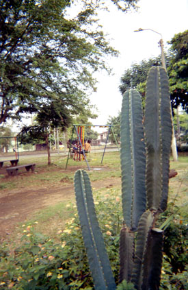 Exterior día. Primer plano de cactus en costado derecho ocupando la mayor porción de escena. Niños en enfoque central en juegos de parque. Calle de fondo.