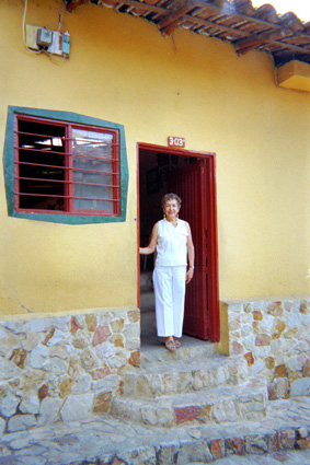 Plano Medio. Puesta en escena de una mujer en el umbral de la entrada de su casa, donde se nota claramente la nomenclatura. Se destaca la textura del muro de color ocre que contrasta con un zócalo elaborado en piedra. En la parte superior se alcanza a apreciar la guadua como material de construcción para el techo.