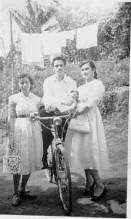 Acompañando al bebé, en su baño de sol, luciendo la cicla de moda. La bicicleta fue el medio de transporte más popular que se utilizó para ir al trabajo, a los pueblos vecinos, para hacer las compras, o ir a pasear con los amigos Caicedonia, 1955.