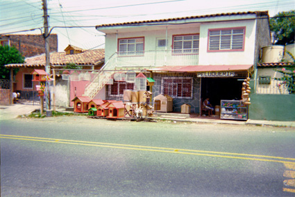 Plano medio. Podemos apreciar una casa grande de dos pisos en podemos observar dos negocios diferentes: una peluquería donde aparece una señora sentada al lado de una vitrina y el otro, venta de casitas para perros y jaulas para pájaros.