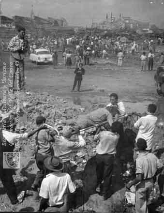 Damnificados de la explosión del 7 de agosto, buscando rescatar algunos enceres de entre los escombros. Santiago de Cali, 1.956