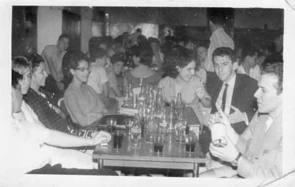 Orlando Escobar, Marino Escobar y Noelia Aguilar, entre otros amigos departiendo unas gaseosas en el Café Palmira. C. 1965.