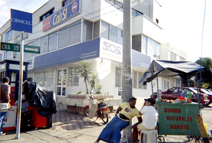 Institución de salud sobre la calle quinta con carrera 39. Un puesto de venta de frutas en el cuadrante inferior derecho. Plano medio.