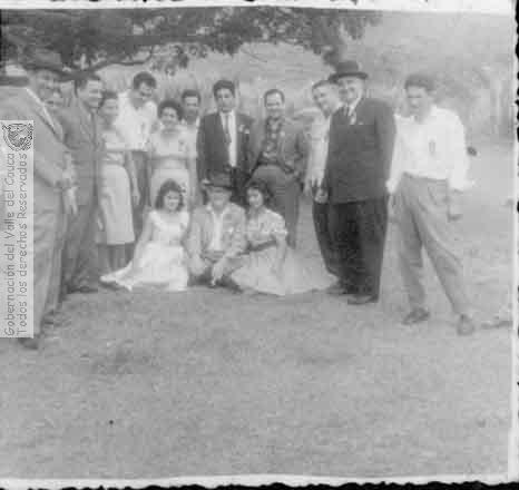 Grupo de amigos en un día de campo. La fotografía data de la época en que le devolvieron el nombre de El Dovio al Municipio en 1958, puesto que en 1956 lo habían cambiado por el nombre de Municipio de Rojas Pinilla.