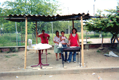 Plano medio. Exterior día. Venta ambulante. Estructura sostenida sobre guaduas. Al fondo se aprecia vegetación. Expresión alegre.