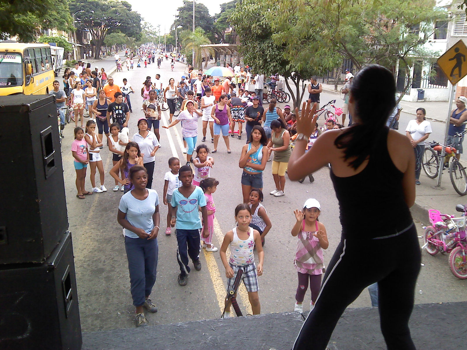 La CicloVida de Cali, es un programa de la Alcaldía de Santiago de Cali, liderado por la Secretaría del Deporte y Recreación, actividad incluyente para toda la ciudadanía, donde se cierran temporalmente las calles para los vehículos y se abren para los habitantes de la ciudad, todos los domingos de 8:00 am a 1:00 pm para que disfruten de un espacio seguro y gratuito para que en familia o amigos disfruten de la actividad física, recreación, deporte y cultura. Se aprecia en la imagen, profesora de aeróbicos en tarima dirigiendo niños y adultos. Observamos a los asistentes haciendo ejercicios