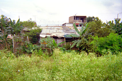 En la imagen se aprecia abundante vegetación y al fondo en medio de ella la fachada de una vivienda, elaborada en madera. Plano medio.