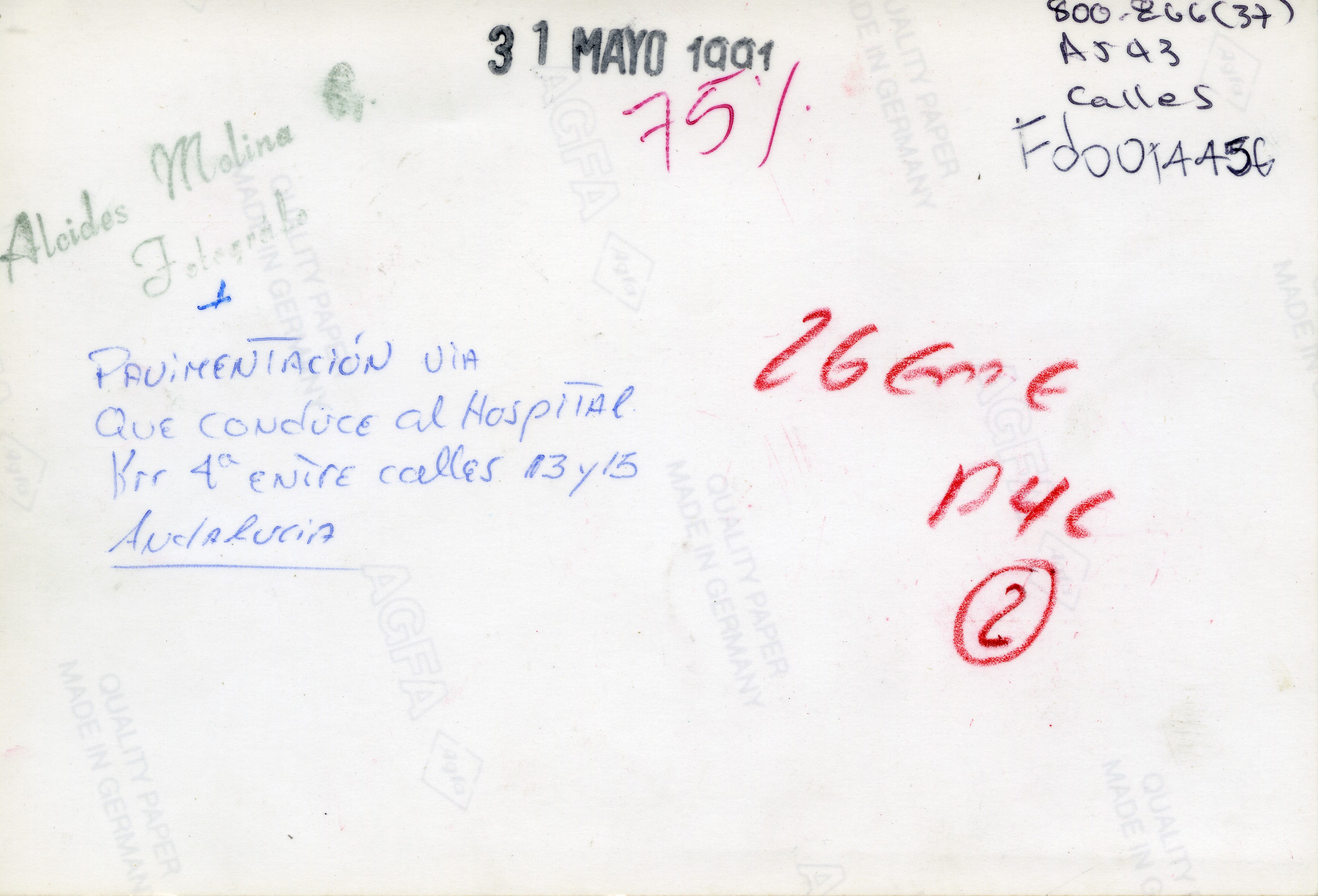 Vista a lo largo de la carrera 4 en pavimentación. Al fondo se observa la iglesia del municipio. Al reverso de la fotografía se anexa nota manuscrita:"pavimentación de la vía que conduce al hospital, Kra 4 entre calles 13 y 15. Andalucía."