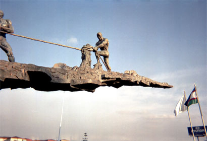 Plano medio. Detalle de escultura. Contraste de tonalidades del cielo. Banderas ondeantes en el costado derecho.