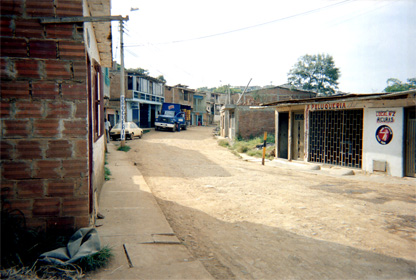 Vía en terreno destapado. Edificaciones al lado de la vía. Negocios en el frente de las edificaciones. Vehículos estacionados. Día soleado. Plano general.