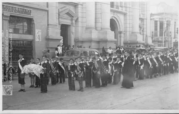 Desfile fúnebre guiado por sacerdote y seguido particularmente por jóvenes varones. Plaza Caicedo. Cali. C. 1950.