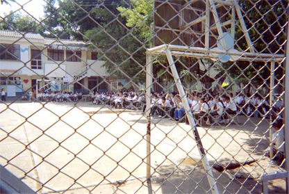 Se aprecian escolares reunidos en patio de una institución educativa. En primer plano malla y arco de fútbol. Exterior día. Plano general.