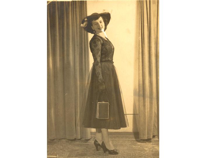 Fotografía de Tulia Ardila muy elegante, con un vestido vaporoso a media pierna; guantes y sombrero acompañante
