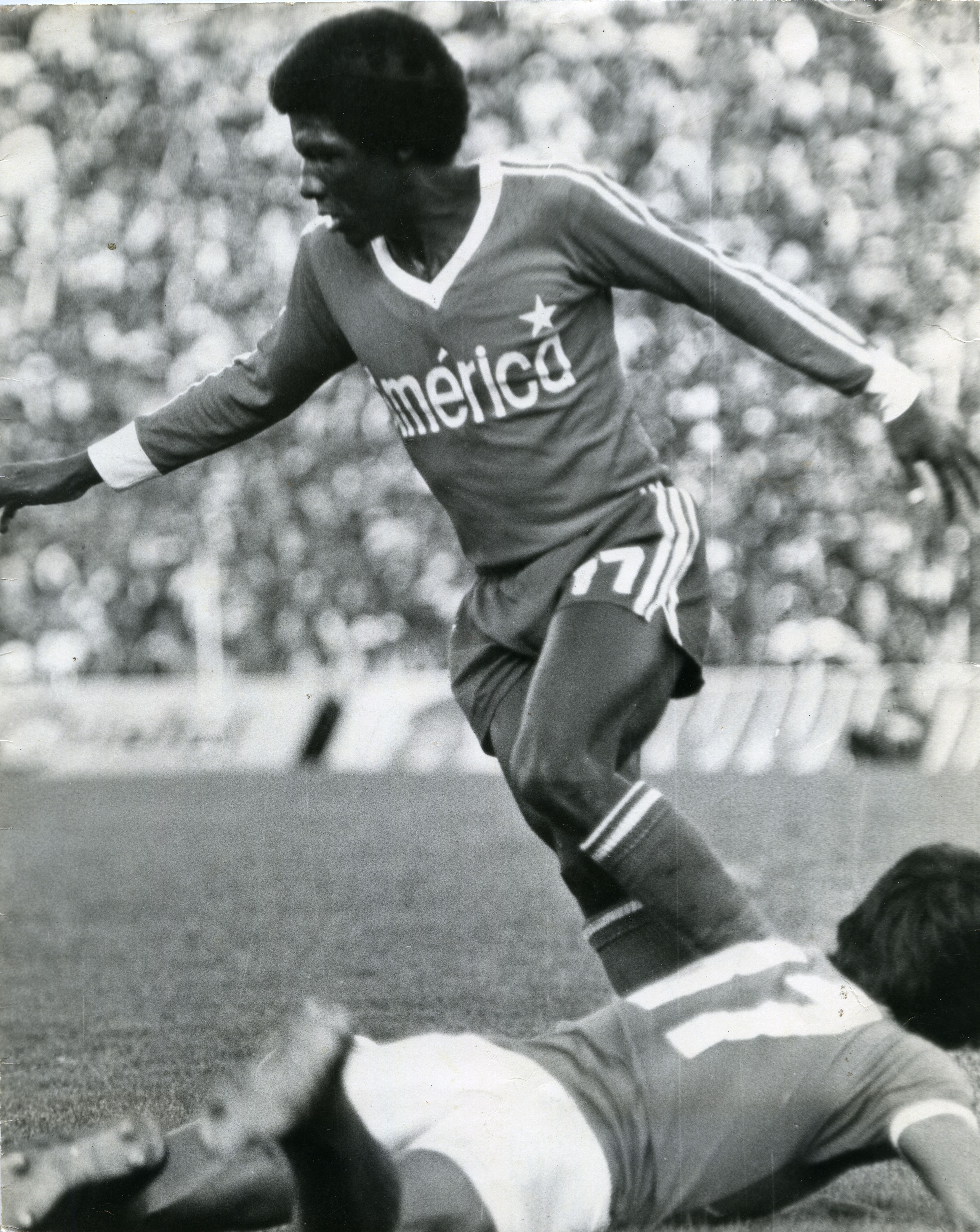 Víctor Lugo fue conocido como el “fabricador de penales” por la cantidad de este tipo de faltas que le pitaron a su favor, durante su carrera deportiva. Anotó 76 goles con el equipo, incluyendo el segundo tanto que le daría a la institución su primer titulo, en 1979. Participó también en la Selección Colombia. Observamos al jugador ganando un balón en un partido ante el Millonarios.