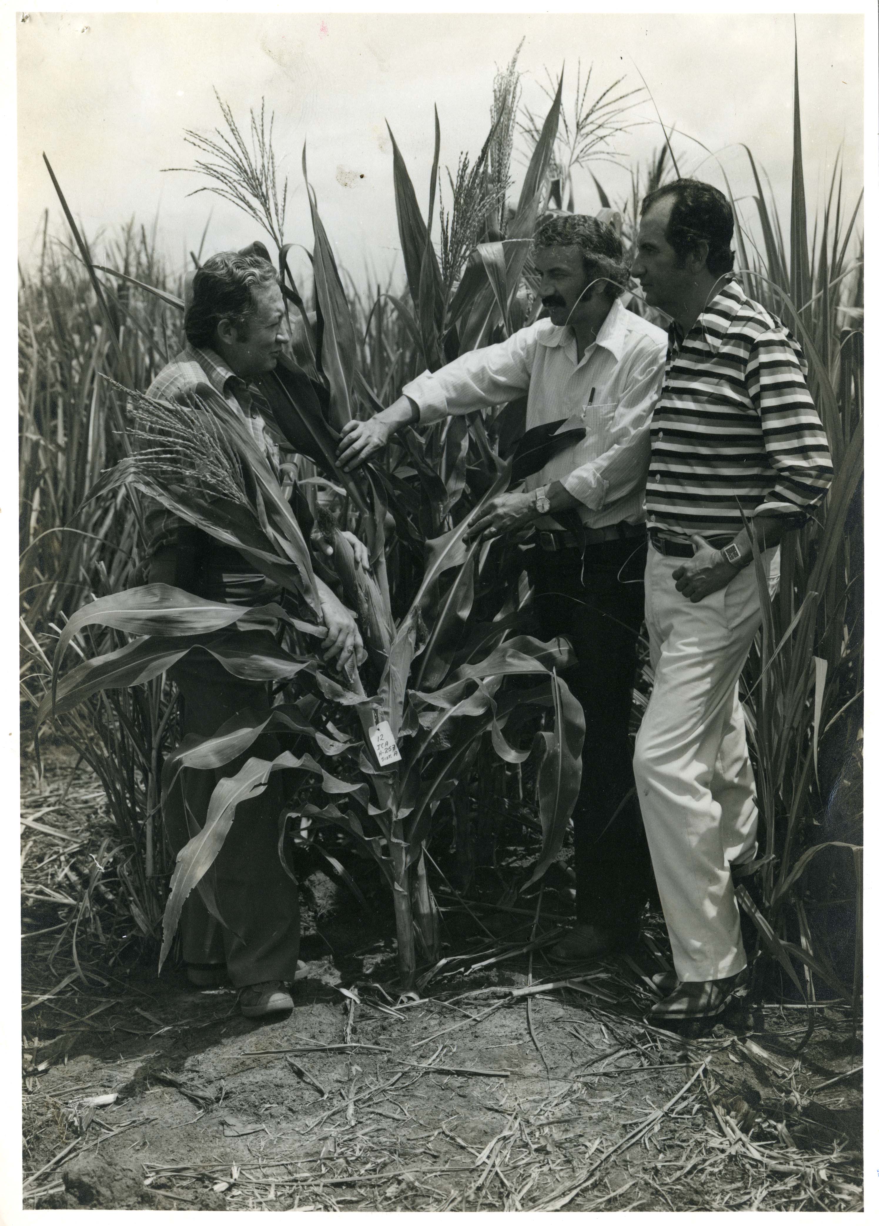 Al reverso de la fotografía se anexa el recorte.Nota manuscrita"Técnicos del ICA y del CIMMYT observan el desarrollo agronómico del maíz interealado con caña de azucar; existen en el Valle del Cauca 45.000 hectáreas anuales de Caña para renovar las cuales pediran intercalarse con maíz".