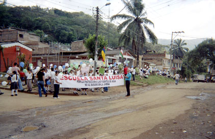 Plano general. Exterior día. Protesta encabezada por escolares por la defensa de los recursos hídricos. Profusión de ciudadanos.