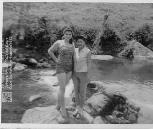Lucrecia Castillo y Ligia Javela, de paseo al río Aguacatal. Este río fue en una época al igual que el río Cali, sitio de recreación de las familias caleñas. Santiago de Cali, 1955.