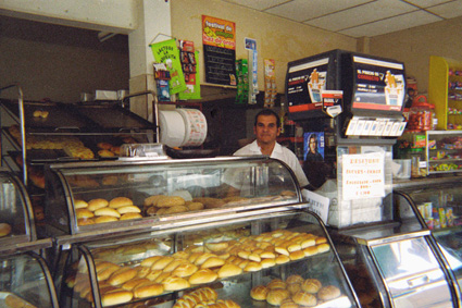 Plano medio de interior de panadería con despachador detrás de la caja. Luz ambiente natural. Conciencia del vendedor frente a la toma fotográfica. En el lado derecho inferior se aprecia el vidrio con el reflejo del día.