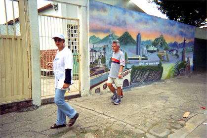 En la imagen se observa una mujer caminando mirando a cámara seguida de un hombre acompañado de un infante del cual solo se observan los pies. Se aprecia mural sobre la ciudad realizado por los estudiantes del colegio La Independencia. Exterior día. Plano general.