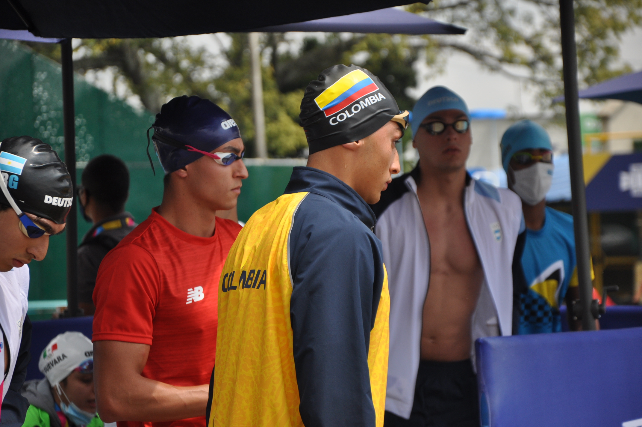 En la fotografía destaca el colombiano participante en la prueba de natación, al fondo aparecen otros competidores de los "I Juegos Panamericanos Junior" llevados a cabo en la ciudad de Cali.