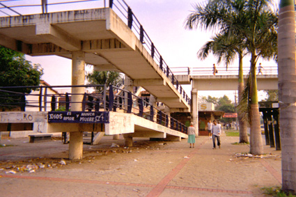 Plano Medio. En la imagen se observa una construcción en concreto correspondiente a un puente peatonal. Donde las vigas definen algunas diagonales dirigidas hacia el centro de la imagen. Al extremo derecho se observan tres palmas alineadas y junto a ellas algunas personas que transitan por la acera.