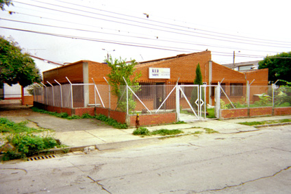 Plano General. Se observa una fachada en ladrillos, con unas diagonales formadas por la vía en la parte inferior y otra dibujada por los cables de electricidad en la parte superior.