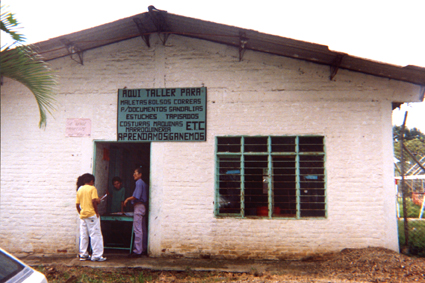 Plano medio. Imagen tomada en exterior, donde se puede apreciar la fachada de una vivienda con muros de color blanco, donde funciona un taller para bolsos carteras y demás. En la puerta, algunas personas.