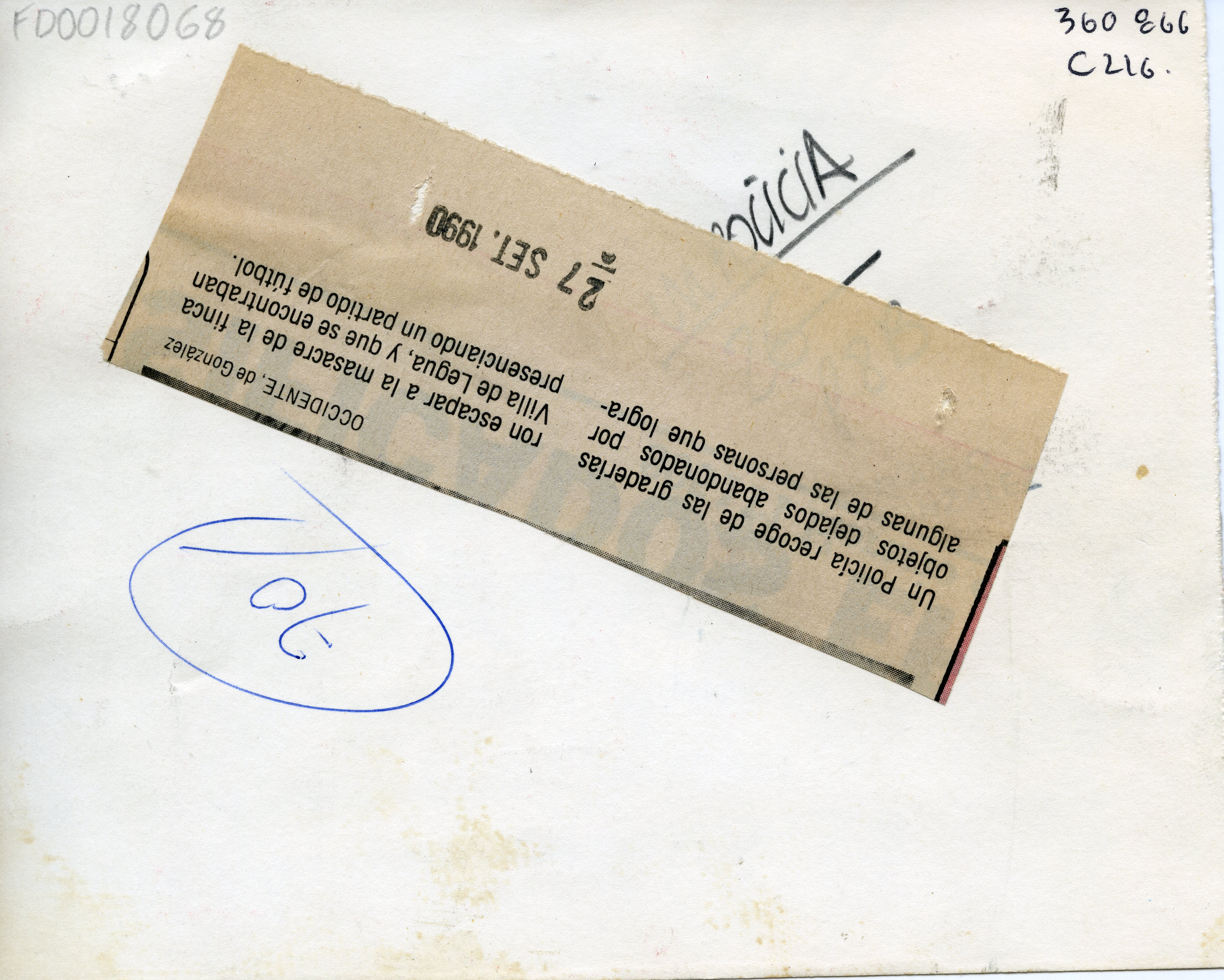 Al reverso de la fotografía se anexa recorte: "Un policía recoge de las graderías objetos dejados abandonados por algunas personas que lograron escapar a la masacre de la finca Villa de Legua, y que se encontraban presenciando un partido de fútbol