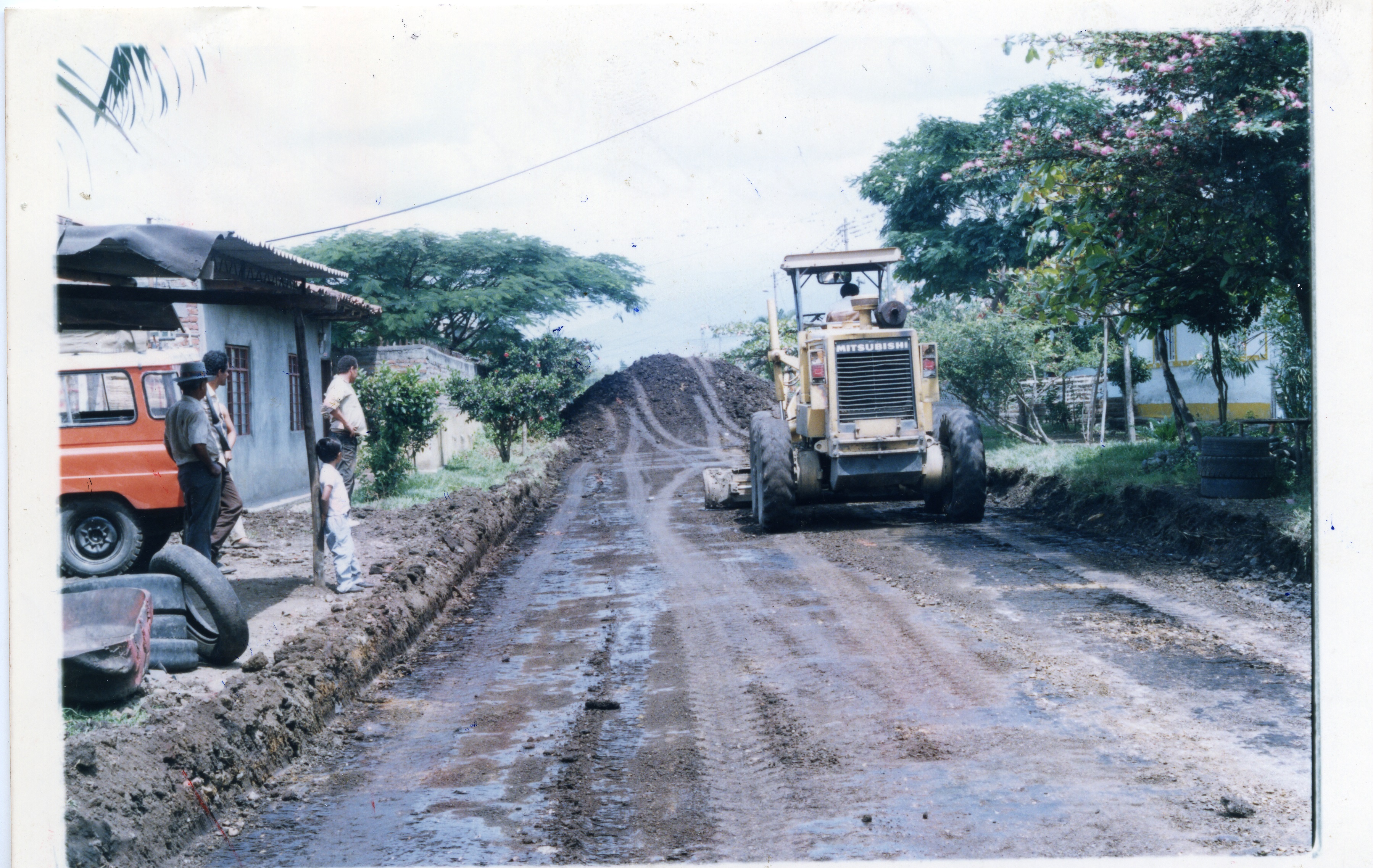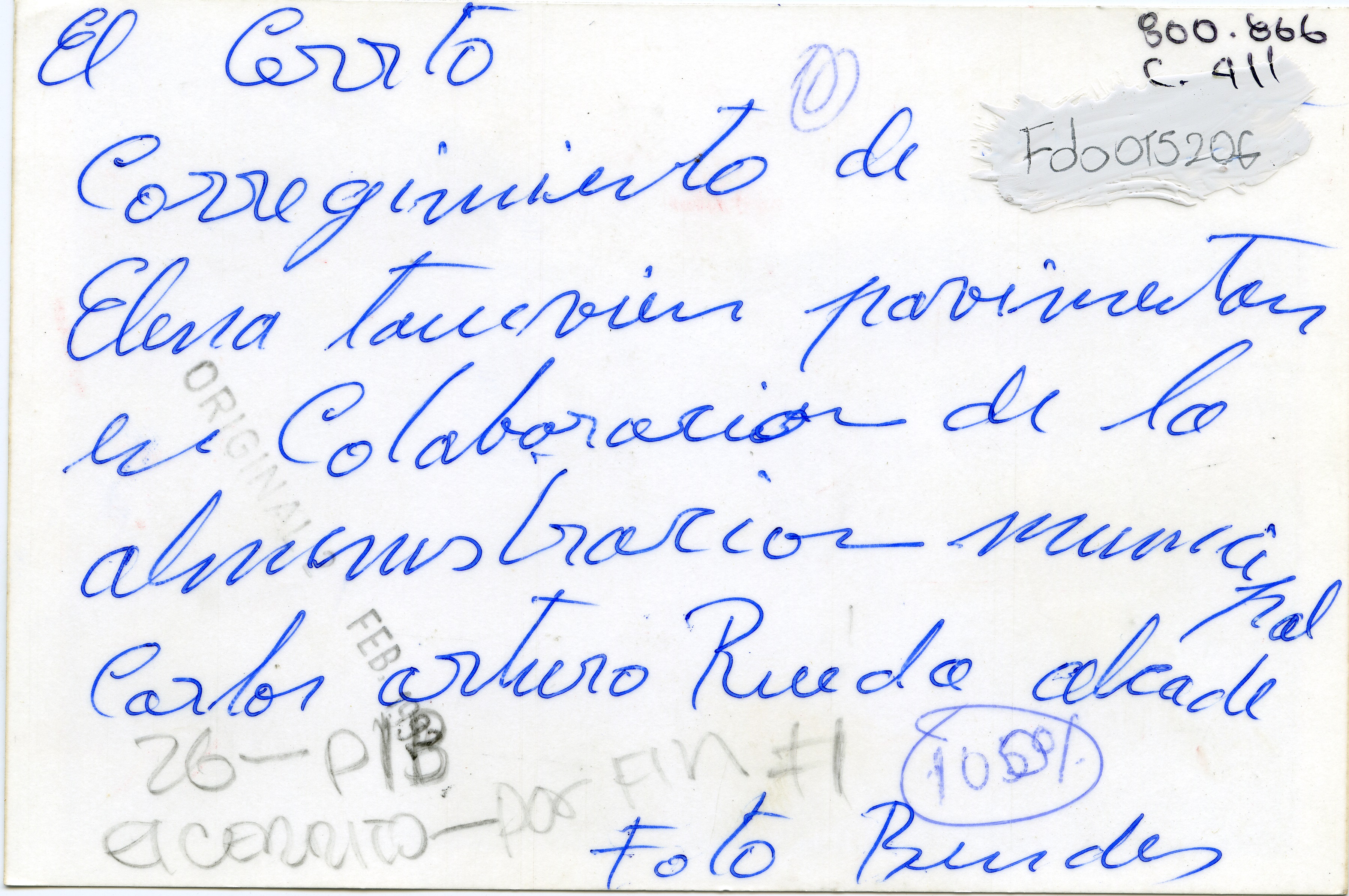 Trabajos de pavimentación y arreglos de la calle como se puede apreciar. Al reverso de la fotografía se anexa: "El Cerrito. Corregimiento de Santa Elena tambien pavimentan en colaboración de la administración municipal Carlos Arturo Rueda Alcalde".