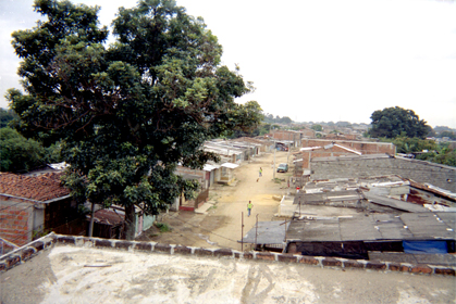 Panorámica en la cual se aprecia en primer plano terraza de edificación. Al lado derecho edificaciones. Calle en terreno destapado y un árbol sobresaliendo en el lado izquierdo de la imagen. Cielo nublado. Plano general.