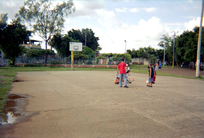 Primer plano de cancha. Exterior día. Jóvenes en contraplano en franja central derecho. División de escena en dos bloques. Casas de fondo.