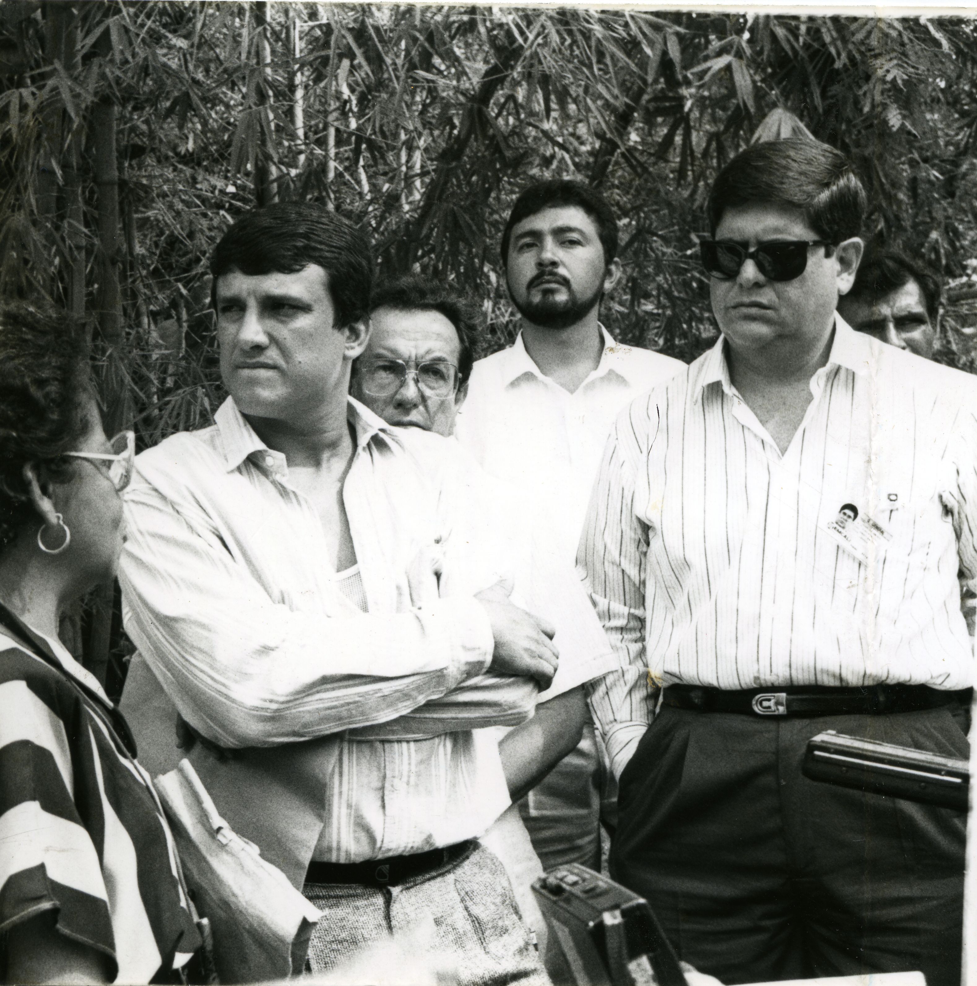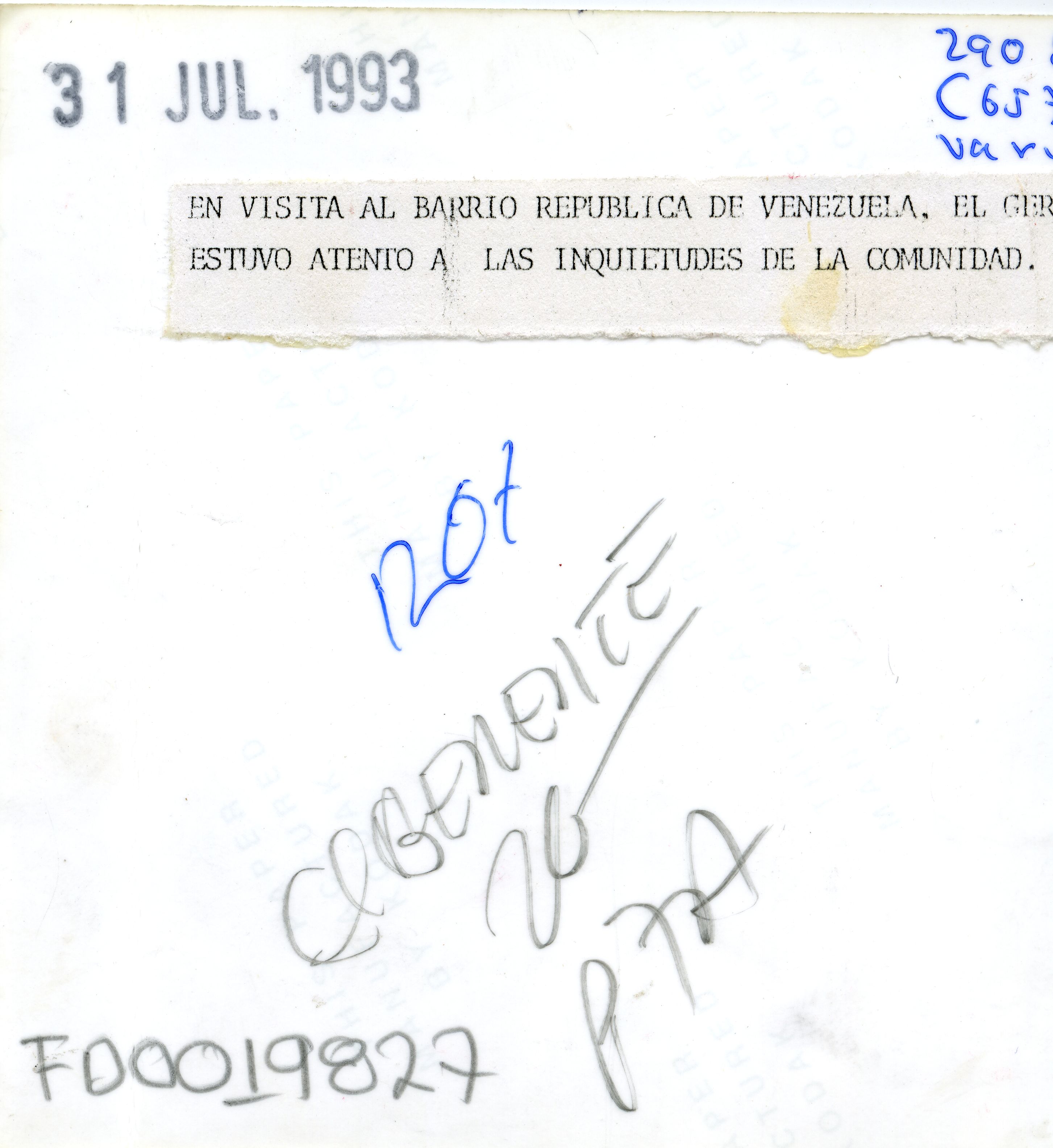 Álvaro José cobo Soto con la comunidad. Reverso: En visita al barrio República de Venezuela. El gerente de la Empresas Municipales de Cali, estuvo atento a las inquietudes de la comunidad