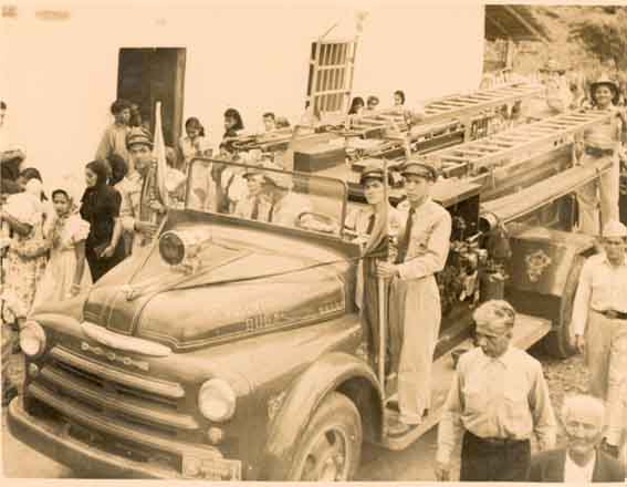 Desfile de la máquina de bomberos acompañando un evento -por identificar-, Buga,1950.