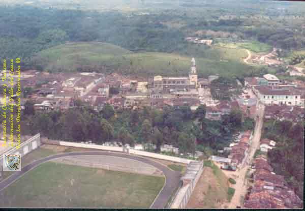 Panorámica de la ciuda, se alcanzan a divisar el Estadio, La Iglesia y las vías principales del Municipio de Alcalá. C. 1995.
