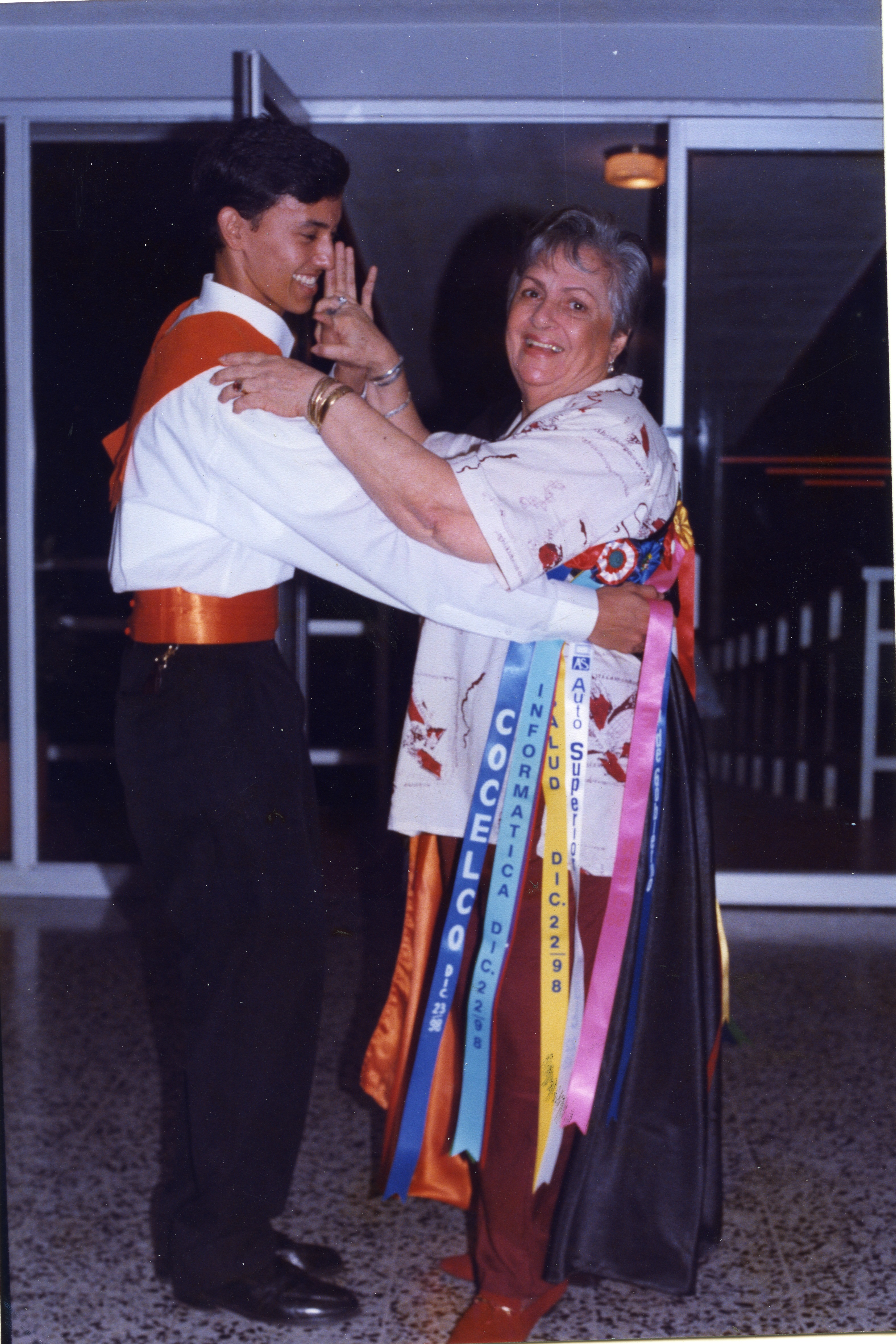 Olga Lozano de Cruz bailando junto con joven artista con motivo de la celebración de su cumpleaños.