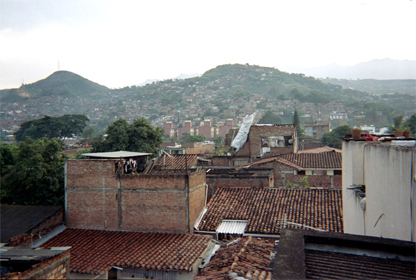 Se observan tejados de residencias en el barrio Caldas. Al fondo edificaciones en zona de ladera. Plano general.